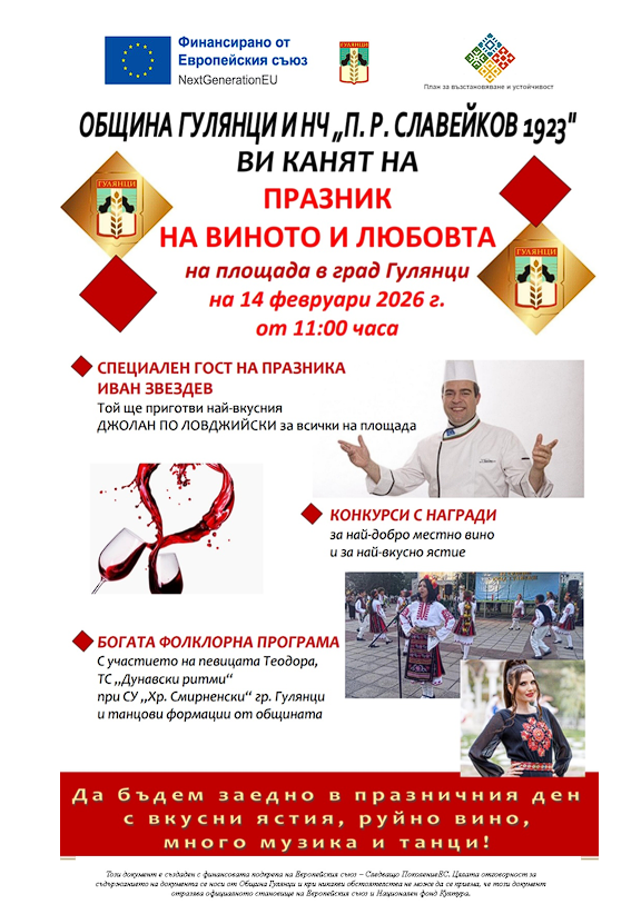 Община Гулянци и читалище „П. Р. Славейков“ гр. Гулянци организират пъстър и вкусен Празник на виното и любовта на 14 февруари